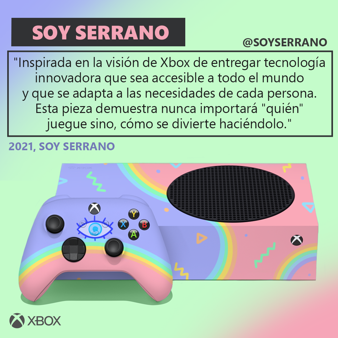 Finalmente pero no menos importante Soy Serrano, a través de su diseño, “Pastel Club S” ,logra mostrarnos que todos somos únicos, pero podemos encajar con otros por tener una afinidad en común como los videojuegos. “Me encanta poder enseñar mi punto de vista hacía la consola y el mundo del gaming mediante mi trabajo. Fue fácil ya que siempre he tenido una imagen muy clara en mi mente de cómo se verían los colores pasteles plasmados en un Xbox, así que traté de reflejar eso”, comentó el artista.