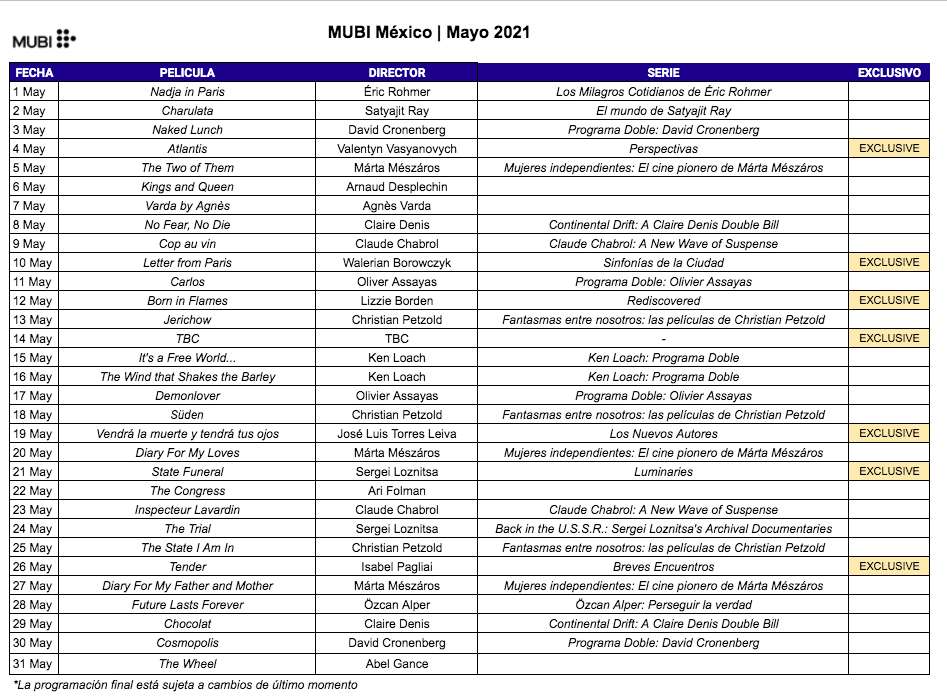 MUBI, el servicio global de streaming con curaduría, anuncia cuáles serán las películas que estarán disponibles a lo largo de mayo en su plataforma. El quinto mes del año brindará sorpresas para todos los gustos cinematográficos con lo más distinguido del séptimo arte.