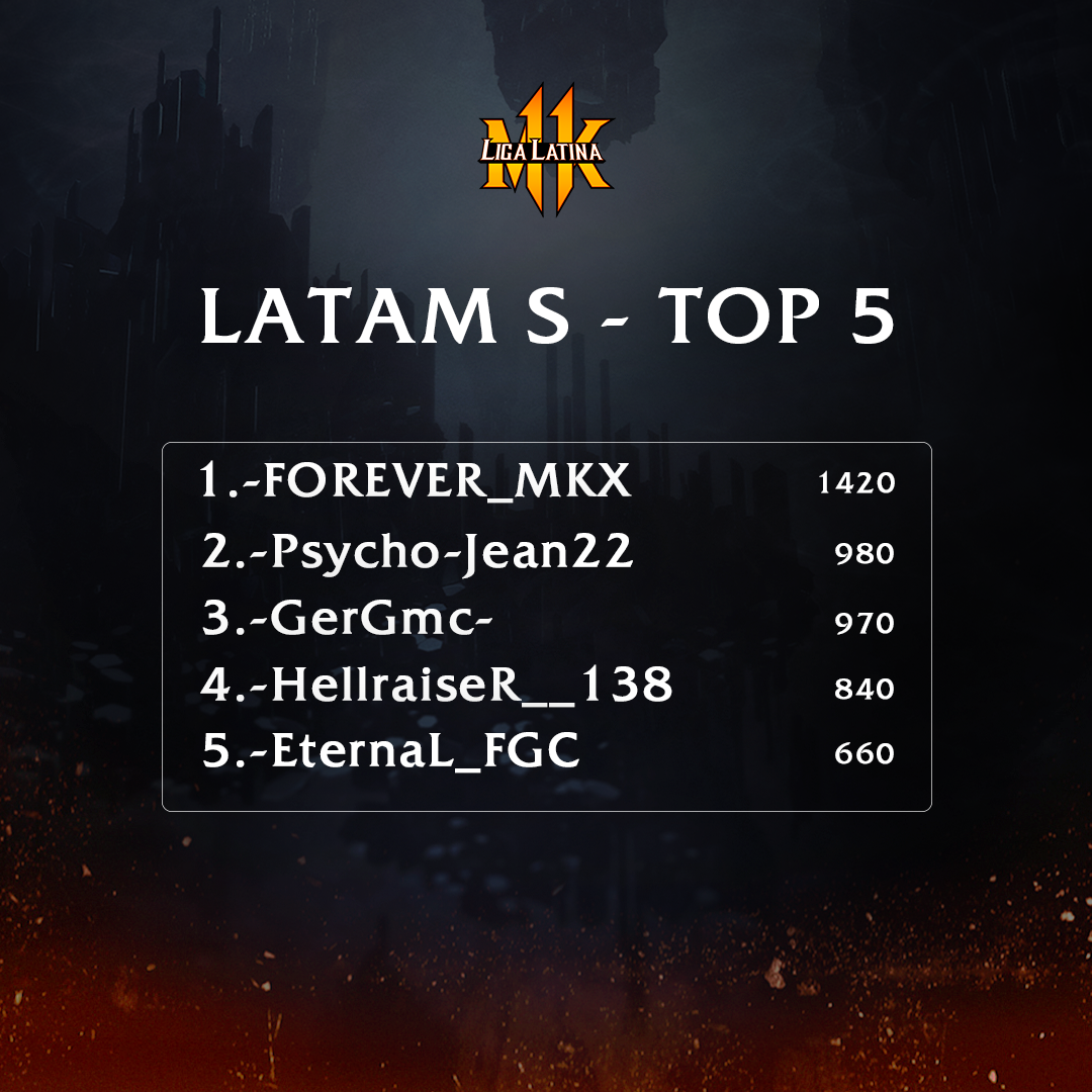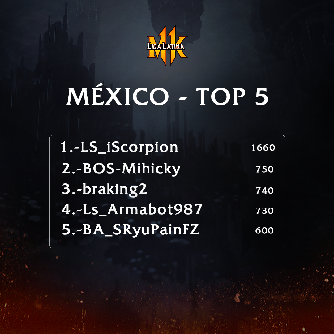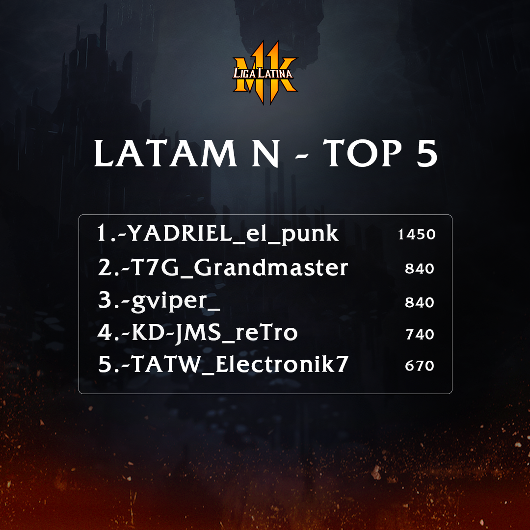 En el torneo pasado, los luchadores mostraron sus destrezas y así quedó confirmado el Top 5 de cada región, con YADRIEL_el_punk (Latinoamérica Norte), FOREVER_MKX (Latinoamérica Sur) y iScorpion (México) manteniéndose en la cima: