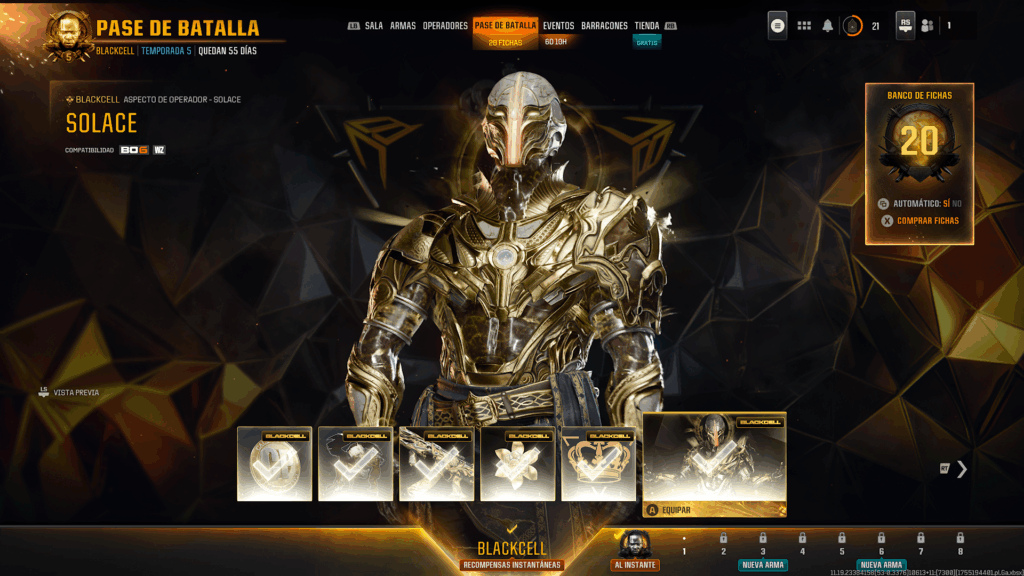 - Operador BlackCell de la S5: “Solace” — estética dorada “celestial” con efectos animados. Desbloqueo inmediato junto a la Mastercraft “Herald” del Krig C con tracers dorados y Golden Spirit Death FX, la finalización con compañero “Griffin Nabbed”, y el amuleto animado “Iris Rise”. También obtienes retos diarios BlackCell extra y variantes BlackCell para varios Operadores y planos.